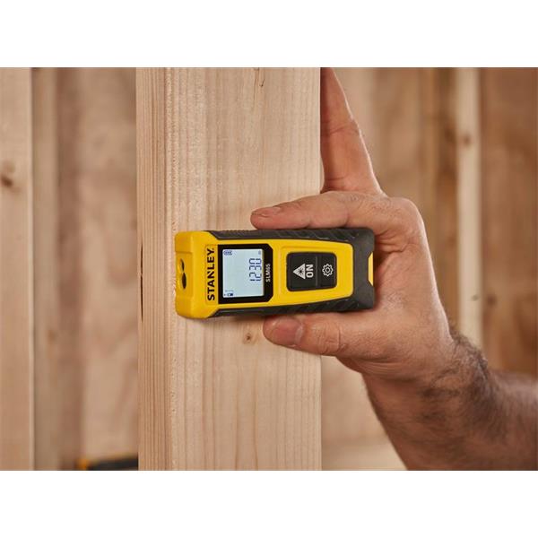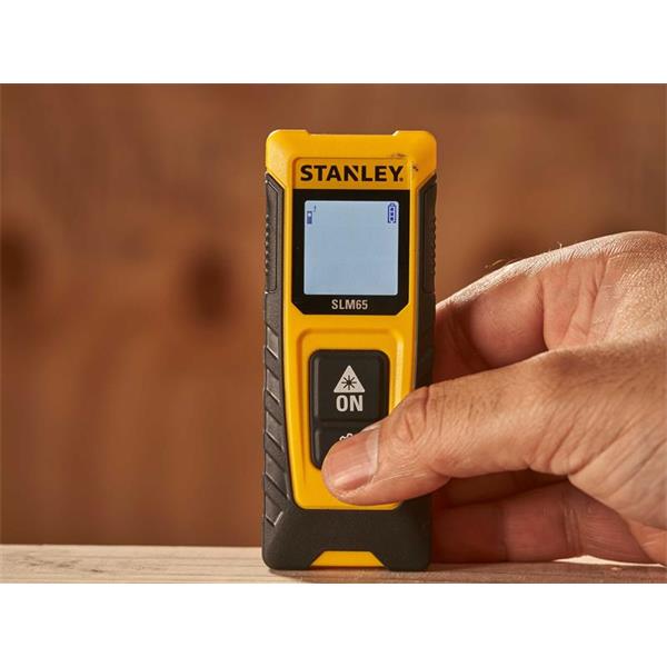 The STANLEY® SLM65 Laser Distance Measure is suitable for a wide range of professional measuring applications. Easy-to-use, thanks to its two-button operation: one to activate the device and take measurements, and a cog button to select different functions. Equipped with a generously-sized screen that displays two rows of measurements. Black characters on a white background make it easy to read measurements, even in bright conditions.