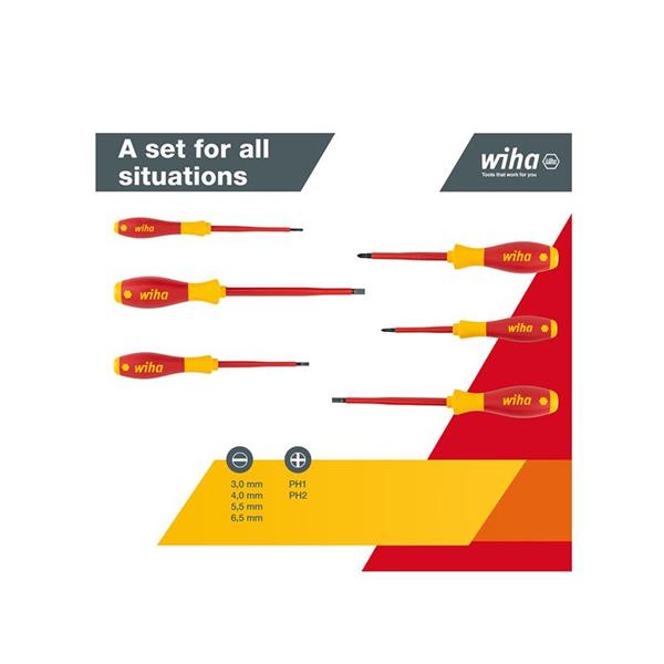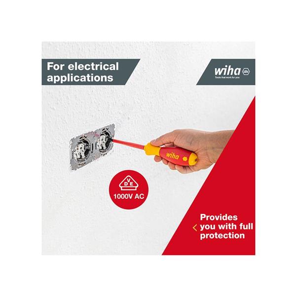 The Wiha SoftFinish® electric Screwdrivers come with a high quality Chrome vanadium steel blade, through hardened with a black-finish. Insulation is moulded directly onto blade. Individually tested at 10,000 V AC and approved for 1,000 V AC.
