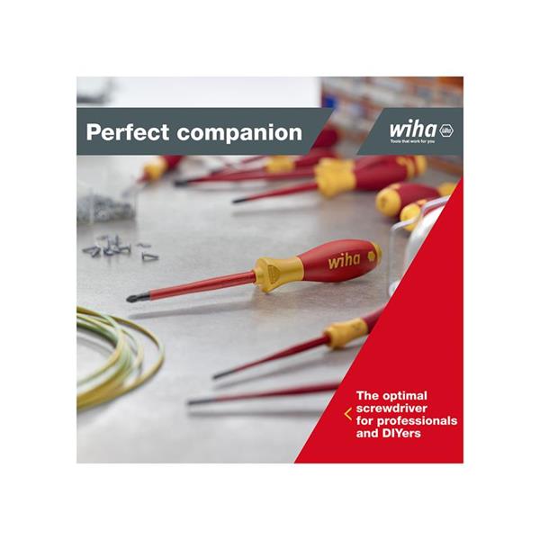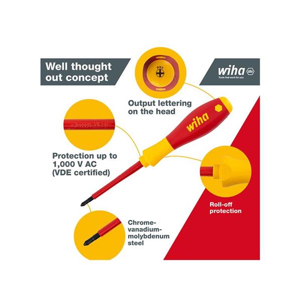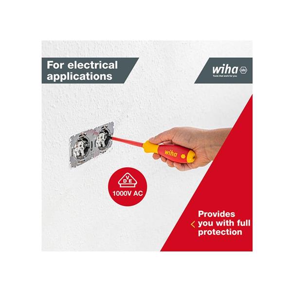 The Wiha SoftFinish® electric Screwdrivers come with a high quality Chrome vanadium steel blade, through hardened with a black-finish. Insulation is moulded directly onto blade. Individually tested at 10,000 V AC and approved for 1,000 V AC.