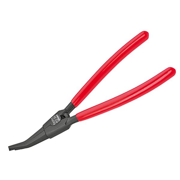 Knipex 45 21 200 Special Retaining Ring Pliers for fitting horseshoe-shaped spring retaining rings and circlips without grip holes. Made from chrome vanadium electric steel, forged, oil-hardened. The angled jaws feature a centering hole and opening spring. Suitable for snap rings larger than 12.0mm.