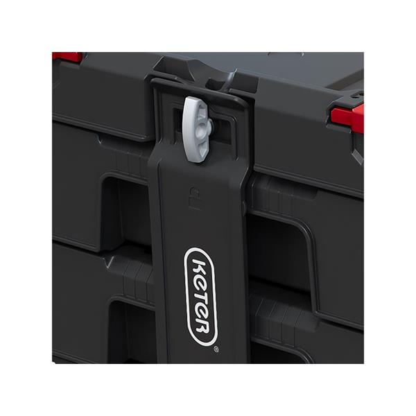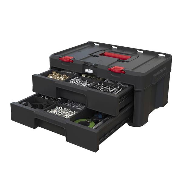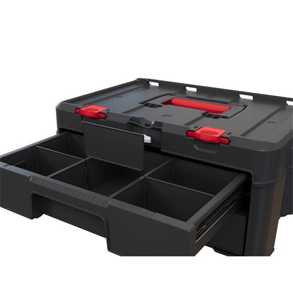 The Keter Stack N Roll 2-Drawer Unit is made from durable polypropylene resin for reliable everyday usage. Full drawer opening offers a complete view of drawer contents. Removable dividers let you customise your space to fit different sized items. A polycarbonate locking strip keeps drawers secured in the storage frame at all times. Fitted with a fold-down carry handle for easy portability.