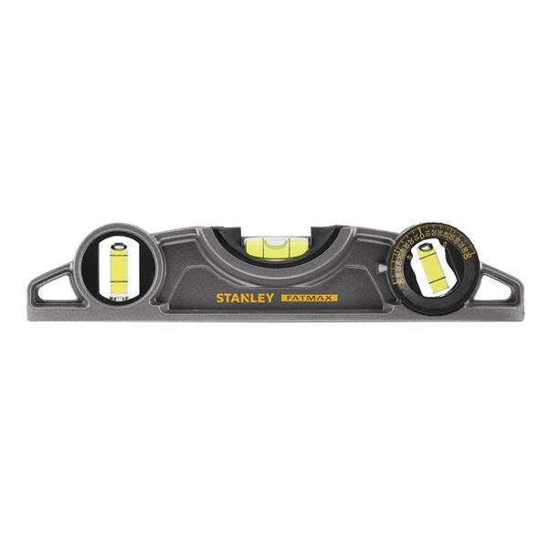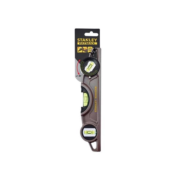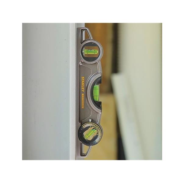 The STANLEY® FatMax® Pro Torpedo Level has a a die-cast aluminium body for long lasting durability. The solid block vial provides accuracy of 0.5mm/m (0.0005in/in), and a 180-degree rotating vial is designed to duplicate angles. It includes a magnified center vial for improved visibility.