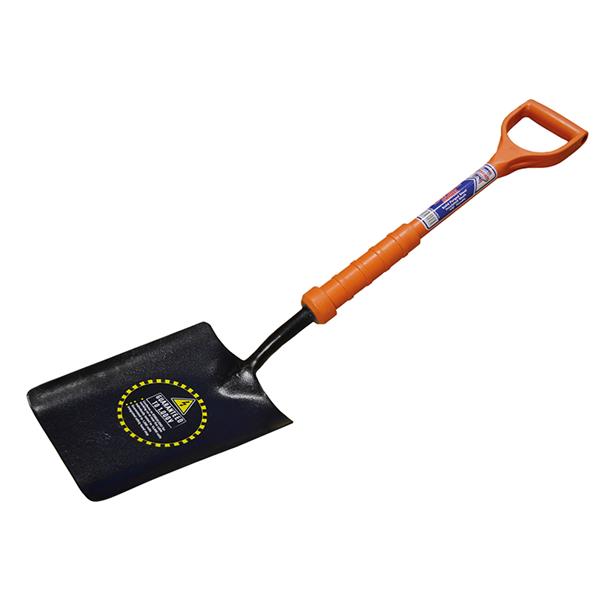 Faithfull Taper Mouth Shovel for working on or near live cables. It has a solid forged steel head and an extra wide ‘YD’ handle. The insulated shaft has a solid fibreglass core and an abrasive resistant orange polymer coating.