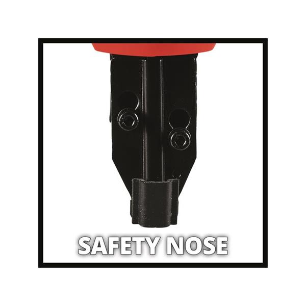 The magazine has a level indicator providing an overview of the current load and maximum capacity of 100 nails or clamps, all securely held by a magnet. It can be easily opened and refilled at the push of a button. The pressure mechanism on the stapler nose allows safe working, while large softgrip surfaces offer comfortable and firm hold.