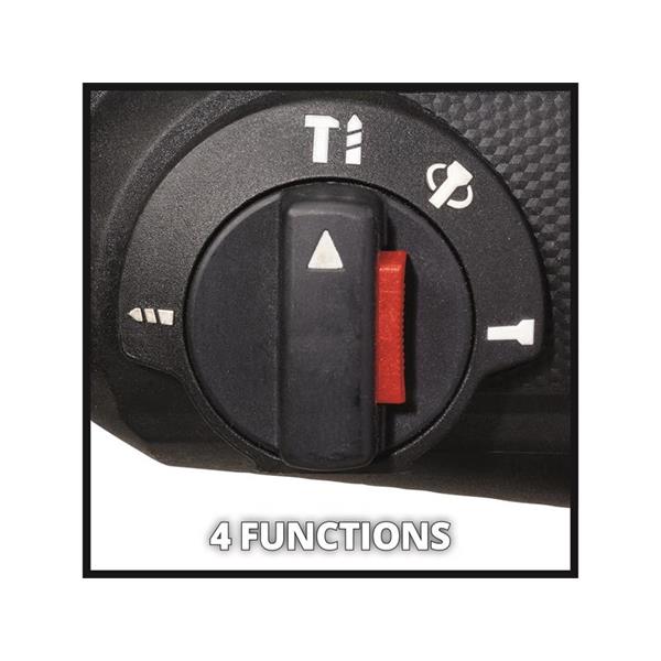 The Einhell TE-HD 18/20 Li - Solo Power X-Change Rotary Hammer has 4 functions; hammer drilling, drilling and chiselling with and without fixing. The pneumatic impact mechanism ensures a powerful 1.8 joules impact force. A powerful motor and a robust metal transmission deliver high torque.