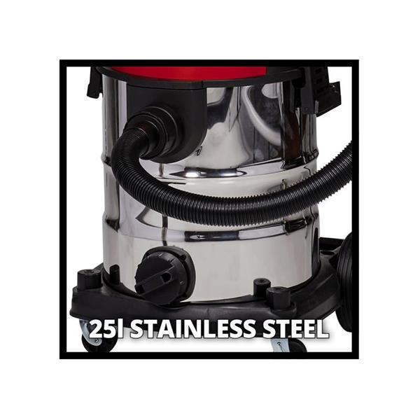 The air pressure regulator on the handle allows the suction power of up to 150 mbar to be adjusted to sensitive work areas. The rustproof and sturdy stainless steel container can hold up to 25 litres of dirt and liquids, and the integrated water drainage screw makes emptying the vacuumed liquids child's play. Thanks to wheels, castors and carrying handle, the wet-dry vacuum cleaner can be transported to the place of use without effort.