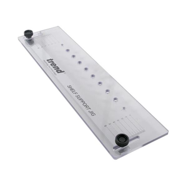 The Trend TEMP/SS/A Template allows routing or drilling of 32mm centre holes for 5mm diameter shelf supports. Made from clear plastic with an adjustable clamping bar with two locking knobs. This template can be used to add existing holes to a unit, or for user-made shelves, the index lines to allow for easy setup. Holes can be positioned between 10 and 64mm from the edge of the board.