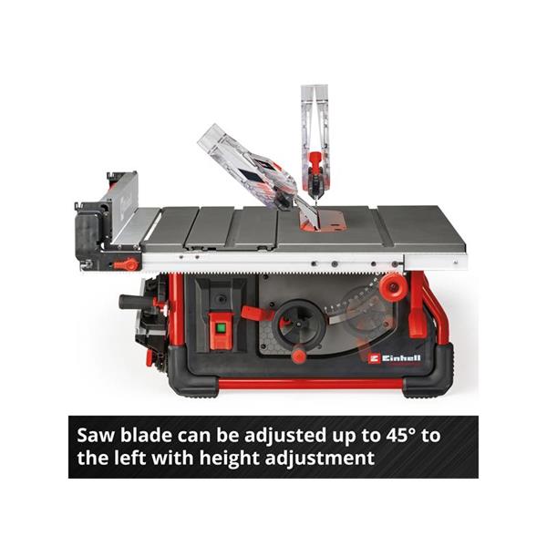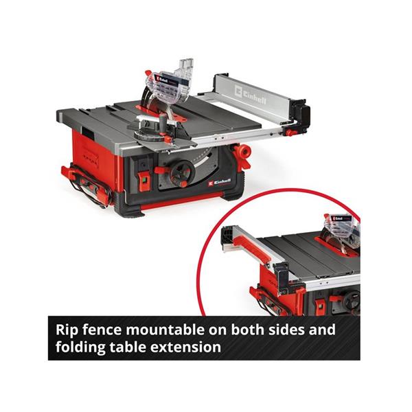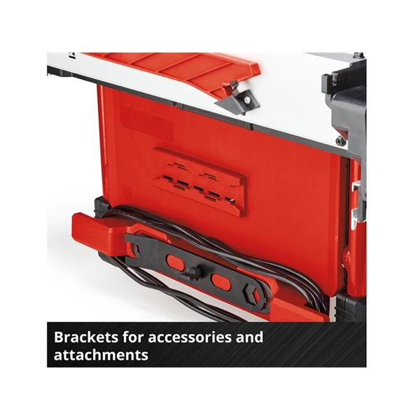 If the working area needs to be kept clean, any Einhell wet and dry vacuum cleaner can be connected to provide suction via the extraction adapter. The saw has a soft start function to protect both the motor and the fuses. The sturdy steel frame construction with rubberized feet ensures secure positioning of the table saw with low vibration, while multiple transport handles, a cable winder and brackets for all attachments and accessories facilitate transport.