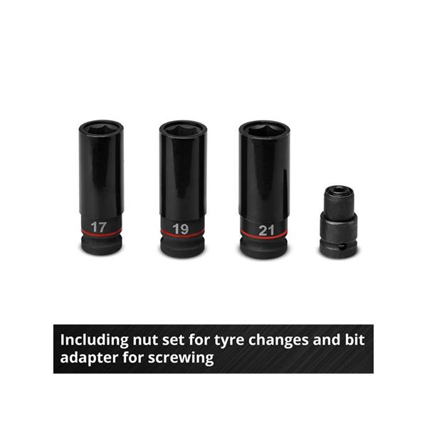 It has an integrated LED light for optimum visibility of your working area. In order to quickly have both hands free while working, a belt clip is provided for easy interim storage of your cordless impact wrench on your belt. With its internal hexagon bit adaptor, supplied, you can also screw in large, long wood screws without any problems.  A practical nut set for changing tyres is also included in the scope of delivery.