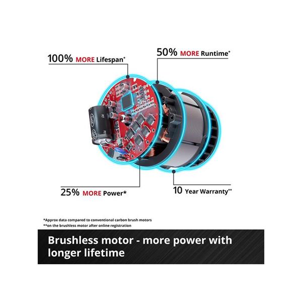 The Einhell TP-CW 18/750-C Li BL PROFESSIONAL Impact Wrench is a high-performance device for powerful screwdriving work and easy tyre changes. Driven by an Einhell brushless motor. This brushless motor provides more power and longer running times than a conventional carbon brush motor. Once you register online, there is a 10-year warranty on the brushless motor.