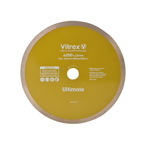 The Vitrex 10 3412 Ultimate Diamond Blade is suitable for use in a tile cutter and has both high strength and durability. It has a continuous rim which produces extra clean cuts on ceramic, porcelain, granite, marble and natural stone. In addition, it helps to prevent chipping and cracking of tiles, which can be a common problem.