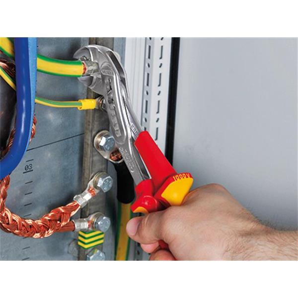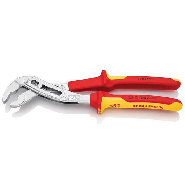 These Knipex 88 06 Series Alligator® VDE Water Pump Pliers are fitted with multi-component grips, VDE tested up to 10,000V and safe for work up to 1,000V. They conform to DIN EN / IEC 60900. Self-locking on pipes and nuts: no slipping on the workpiece and low handforce required. With a box-joint design for high stability.