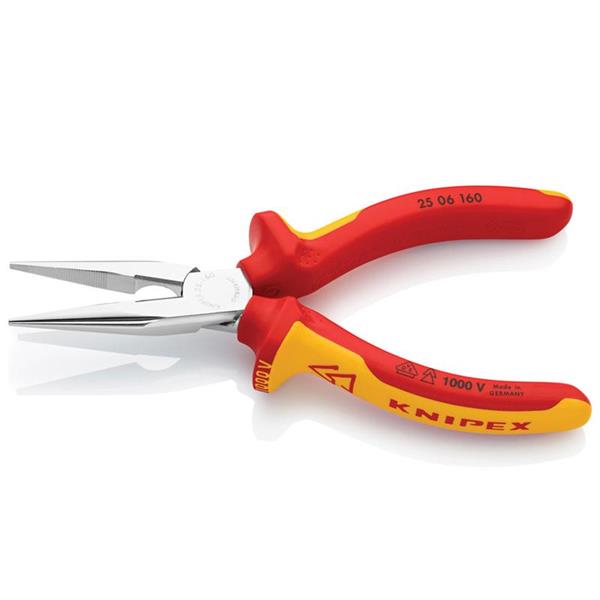 These Knipex 25 06 Series Snipe Nose Cutting Pliers (Radio Pliers) are fitted with multi-component grips, VDE tested up to 10,000V and safe for work up to 1,000V. They conform to DIN EN / IEC 60900. Made from vanadium electric steel, forged, multi stage oil-hardened. Chrome plated finish. Half-round, long, tapered jaws with knurled gripping surfaces. With cutting edges for medium hard and hard wire. The cutting edges are additionally induction hardened, cutting edge hardness approx. 61 HRC.