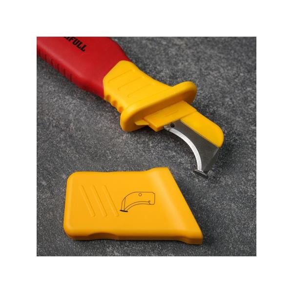 The blade is made from high-quality 60 CRV steel, which provides exceptional sharpness and durability, making it perfect for cutting through tough cable materials. Fitted with a bi-coloured, injected moulded ergonomic handle. Made from insulated PP & TPR, offering a comfortable, non-slip grip that reduces hand fatigue during prolonged use.