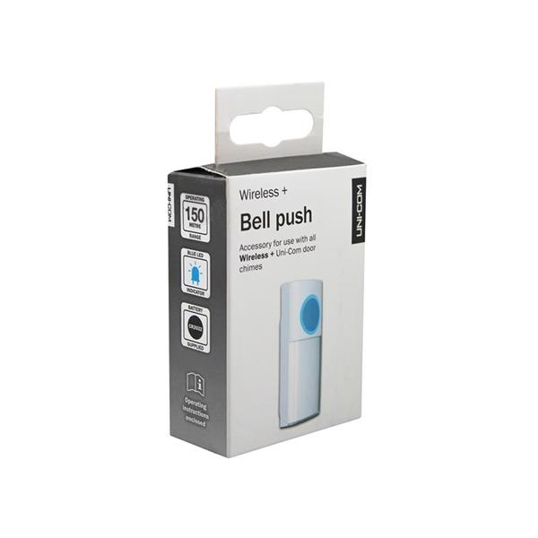 The Uni-Com Wire-free Bell Push is water resistant (IP44 rated) with a blue LED indicator light and nameplate.. Suitable for use with all Uni-Com Wireless + Door Chimes. The bell push is wireless, so no wiring is required, and with an extensive operating range of up to 150m, you never have to miss a visitor or delivery. Easy to fit and set-up. It comes complete with a CR2032 button cell battery, fixing screws and adhesive pads.