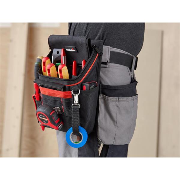 The Hultafors Ziptop Utility Pouch has a main compartment you can close with double-pull zippers. It secures your tools and prevent smaller pieces from falling out. Made in the durable 1680 Denier ballistic polyester fabric. It includes a tape measure clip and an electrical tape strap for easy access. When you are done for the day, you just close the zipper and detach the pouch, knowing everything is secure and will stay there.