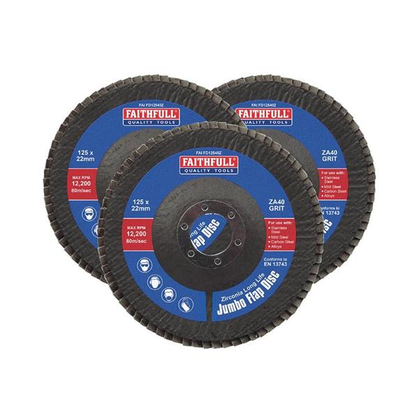Pack of 3 Faithfull Zirconia Abrasive Jumbo Flap Discs 125 x 22mm 40 Grit